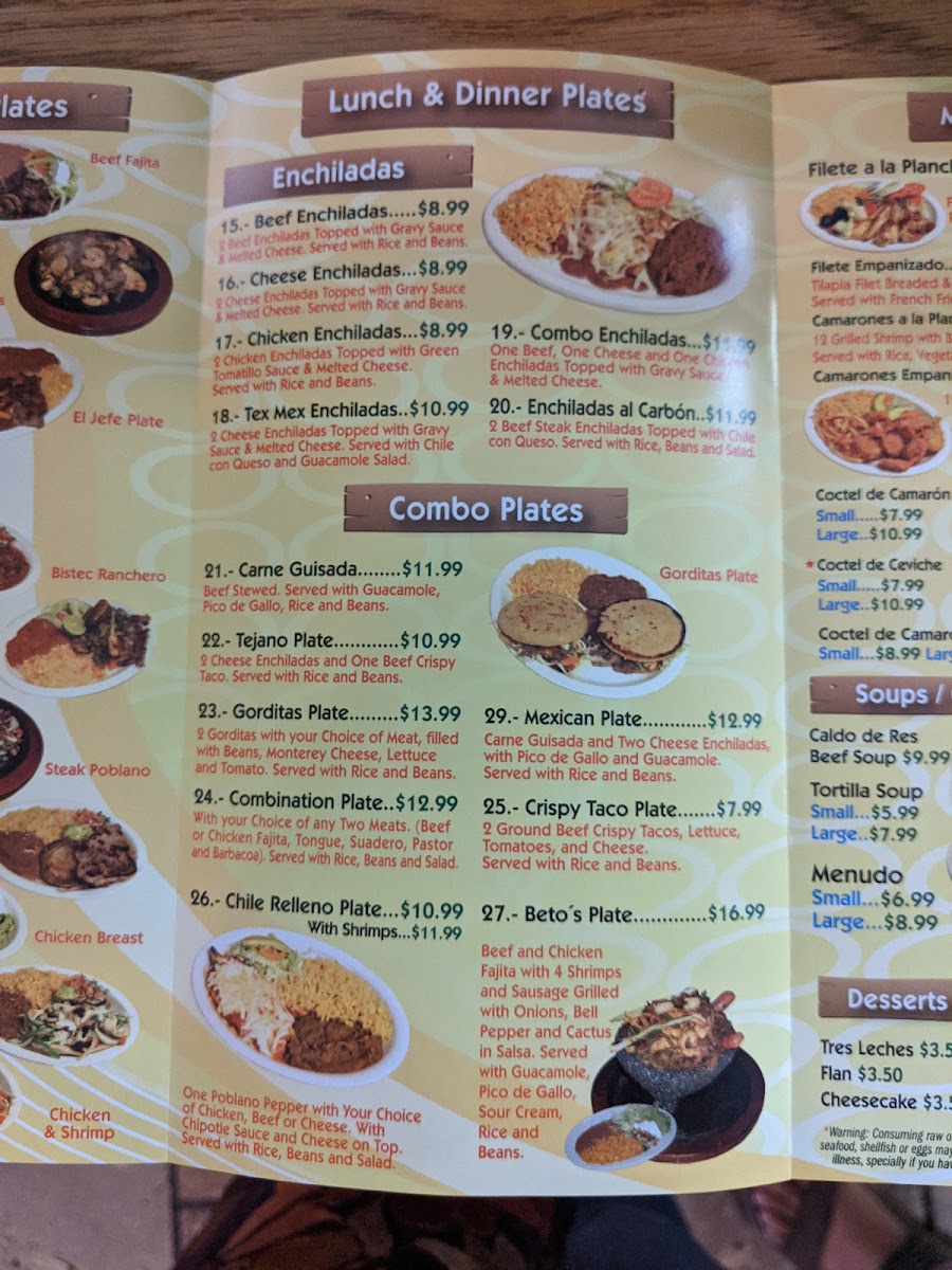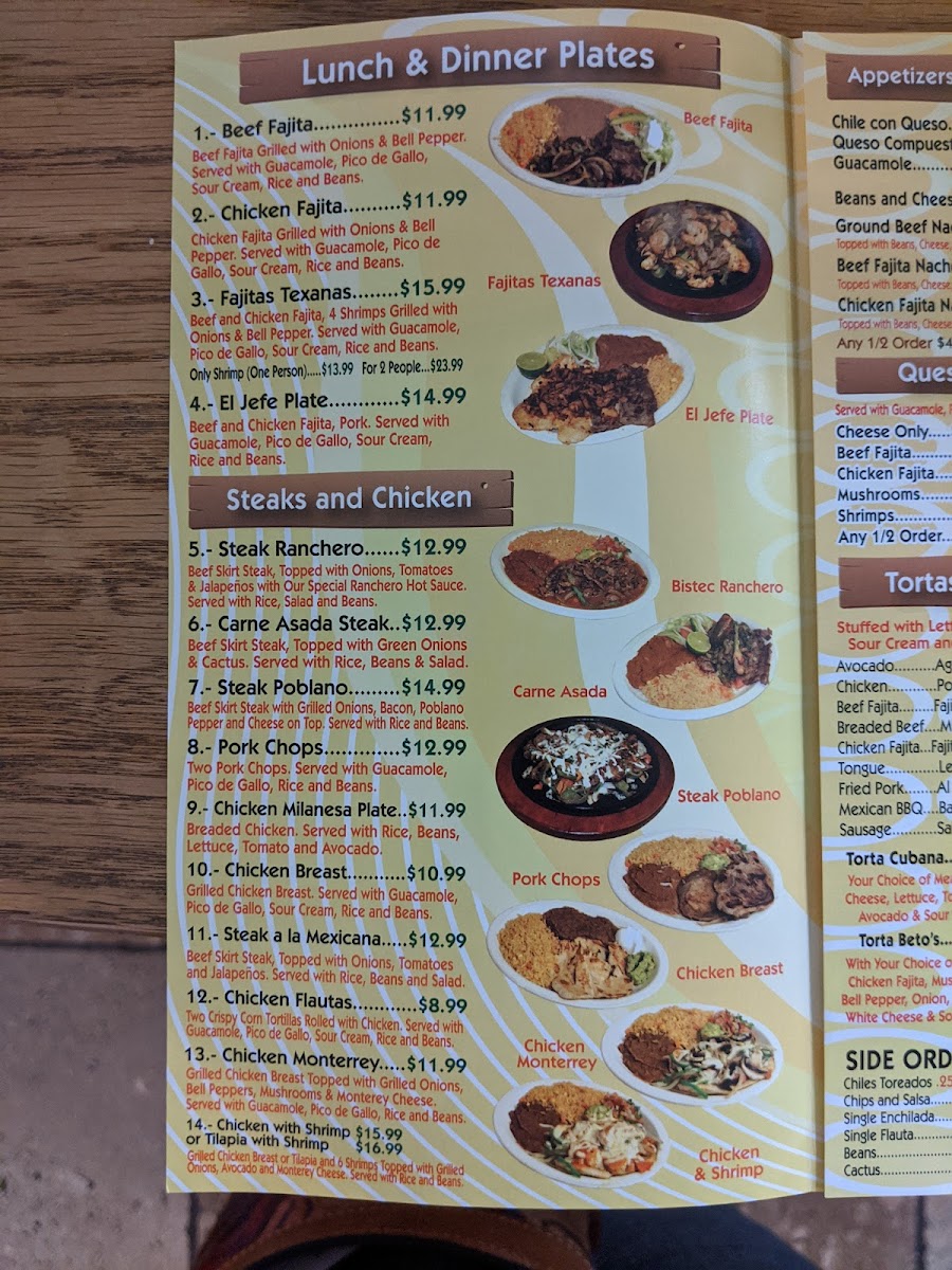 Welcome to Beto's Restaurant #2, a delightful culinary gem nestled in Austin, TX. This vibrant eatery specializes in authentic Mexican cuisine, offering a menu that’s rich in flavor and variety. Must-try dishes include the Beef Fajita or Chicken Fajita, each grilled to perfection with onions and bell peppers, paired with fresh guacamole, pico de gallo, sour cream, rice, and beans—all for just $11.99. For those craving more, the El Jefe Plate combines beef and chicken fajitas with pork for a heartier experience at $14.99.